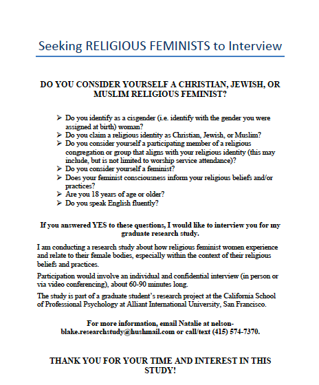 “I am seeking participants to interview for a graduate research study on how Christian, Jewish, and Muslim feminist women experience and relate to their female bodies, especially within the context of their religious beliefs and practices. This study aims to expand the psychology literature on female embodiment to include attention to diverse religious experience, particularly through a feminist lens. Having approached this work through the lens of my own intersecting religious and feminist identities, I am convinced that religious feminists have a critically important voice to contribute to this area of study. Please e-mail Natalie Nelson-Blake at [email protected] for more information about participating in this study. Thank you so much for your interest!”